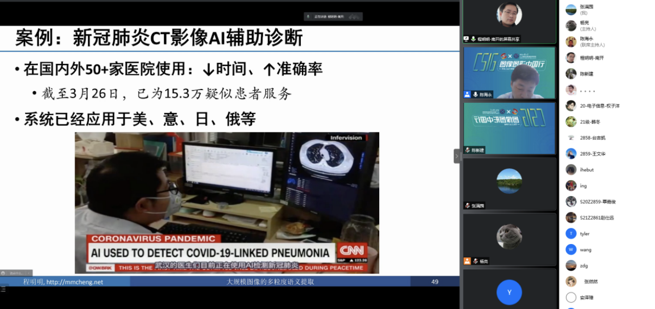 南开大学计算机系系主任程明明教授带来了“大规模图像的多粒度目标检测”的精彩讲座,他们团队的技术成果被应用于华为手机智能拍照、推想科技CT影像智能分析、金风科技风电设备运行监控和中化农业病虫害识别等领域。
