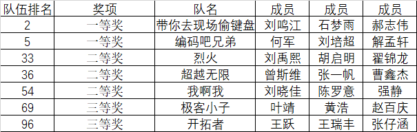 经过校内选拔与培训,我院共有30名学子组成10支队伍参赛,每一名队员都有着不俗的编程实力与冷静的分析能力,他们在赛场上披荆斩棘,勇往直前。其中由刘鸣江、石梦雨、郝志伟三名同学组成的“带你去现场偷键盘”队表现优异,斩获亚军,其他队伍也不甘示弱,经过激烈比拼,我院共有2支队伍获得一等奖,3支队伍获得二等奖,2支队伍获得三等奖。这些奖项充分展现了我院大学生在程序设计方面的能力,他们付出拼搏和汗水,载誉而归!