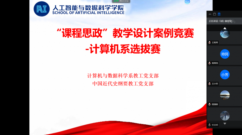 为落实“立德树人”根本任务,实施“铸魂育人”工程,提升教师课程思政建设的意识和能力,不断优化课程思政案例设计,切实把思想政治工作贯穿教育教学全过程,6月26日—29日,色漫网 与马克思主义色漫网 十个“结对共建”的教师党支部开展了线上“课程思政+思政课程”集体备课暨思政课教师指导专业课教师优化课程思政案例设计的教学研讨活动,色漫网 领导班子成员深入各教学部门参加活动。联系计算机与数据科学系教师党支部的校党委常委、副校长段国林参加了本次活动并予以指导。